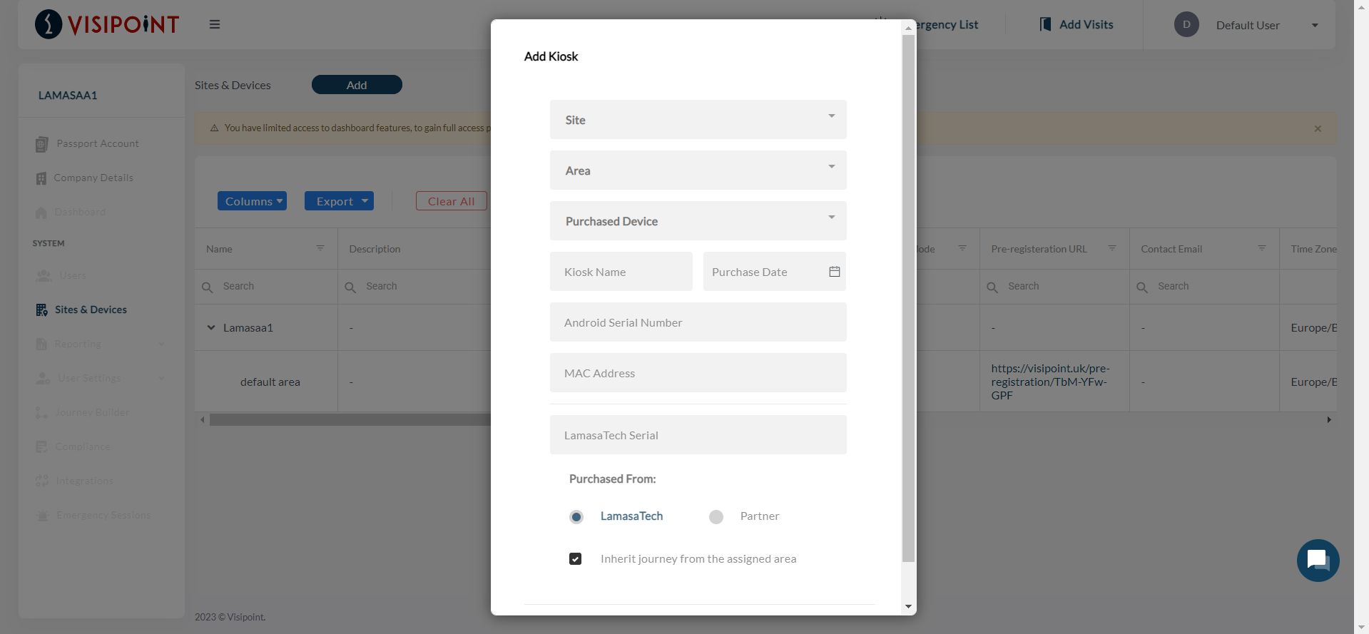 With a standalone dashboard account, all of your settings, entry logs, user journeys etc are managed directly on the kiosk. The dashboard is used only to view your registered kiosks and add kiosks to your account. You will notice that other features are greyed out and you cannot click on them.