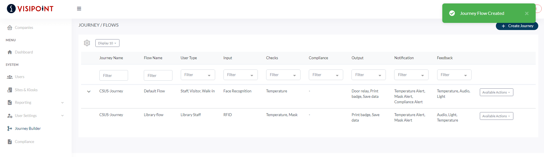 In the example below, you can see we have 2 journeys – LT Main Entrance and LT Warehouse. Within the LT Main Entrance journey, we have the Default Flow plus Library Flow. Whereas the LT Warehouse journey has only one flow for Warehouse Staff.