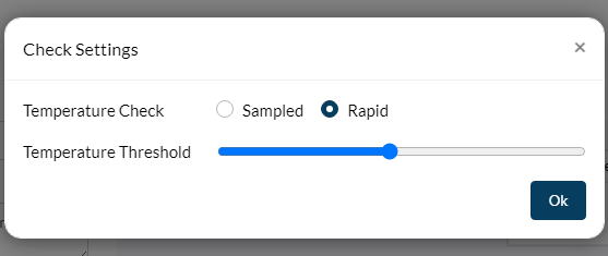 If you have added a temperature check, a cog settings icon will appear next to check. By clicking on the cog settings you can edit the temperature settings. You can set the temperature threshold (the limit above which a temperature is considered too high). By default, this is set to 37.3°C. You set this by using the slider.