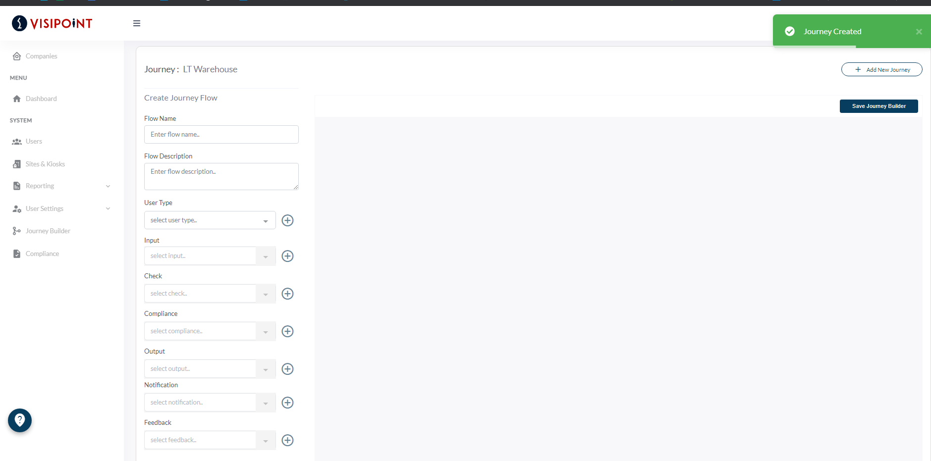 Upon creating a new journey you will get a success message and then be taken to the flow builder page. You will then create your first flow for this journey. Each journey must have one flow created within it. Since this is your first flow for this journey you will notice that all options and user types are available to you (since nothing is assigned to another flow within this journey).