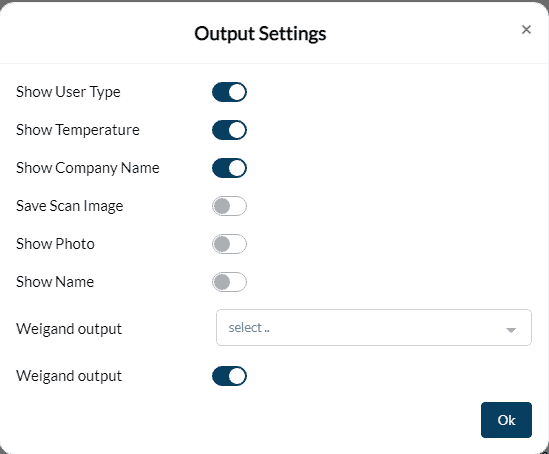– Output Settings: When you click on the Cog icon beside the Output section you can edit your Output settings for print badge, save data and door relay.