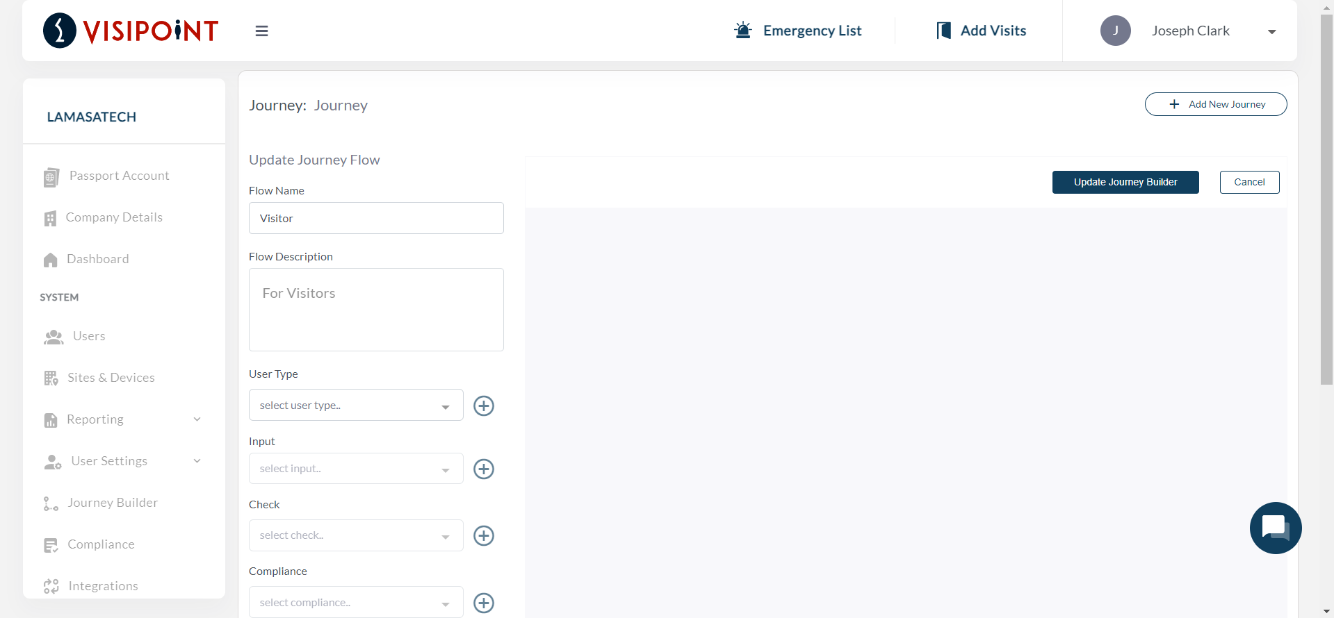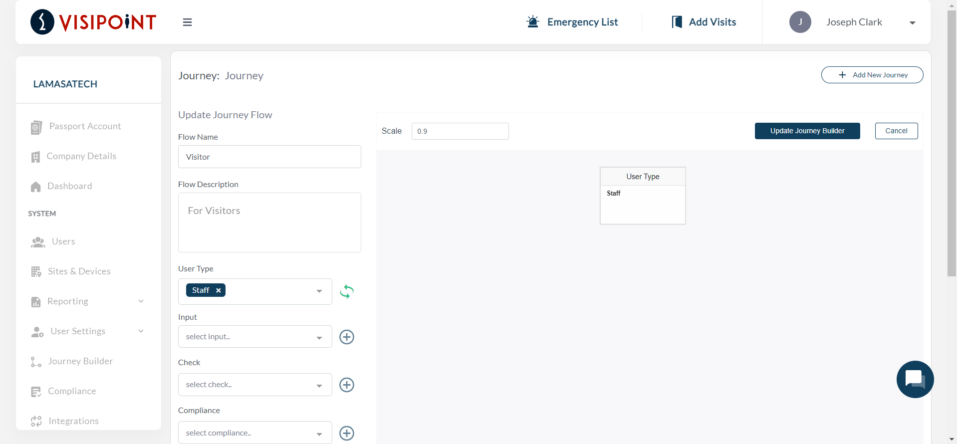 When you edit your journeys for the first time, you will find that there’s a default journey and flow already populated, which includes all three default user types (Staff, Visitor, Walk-In).