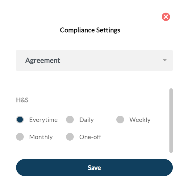 When you have a Compliance added in the flow and you can add as much as you want, you can select how often the compliance will be required to be answered by clicking on the cog settings icon. You can choose from: