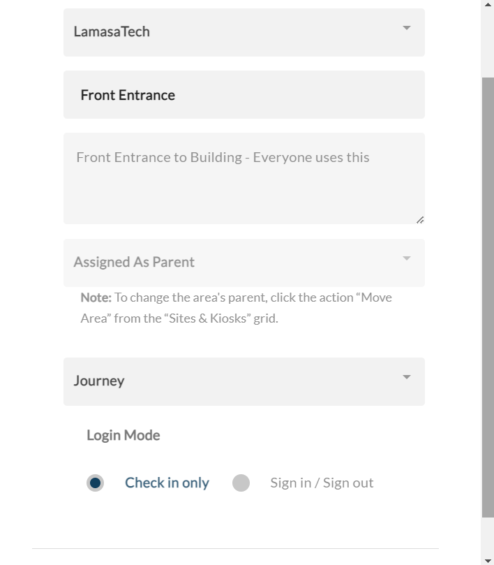 You will be able to either choose the same Journey applied to the area by ticking the box saying “Inherit Journey from the assigned area” or if you untick this it will display a dropdown box allowing you to choose another journey.