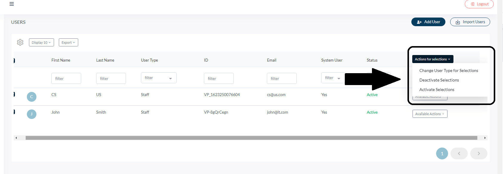 If you select more than one row, there will be a multi-action button on the top right called Actions for selections. For multiple users, we can change the user type, activate users or de-activate users all at once.
