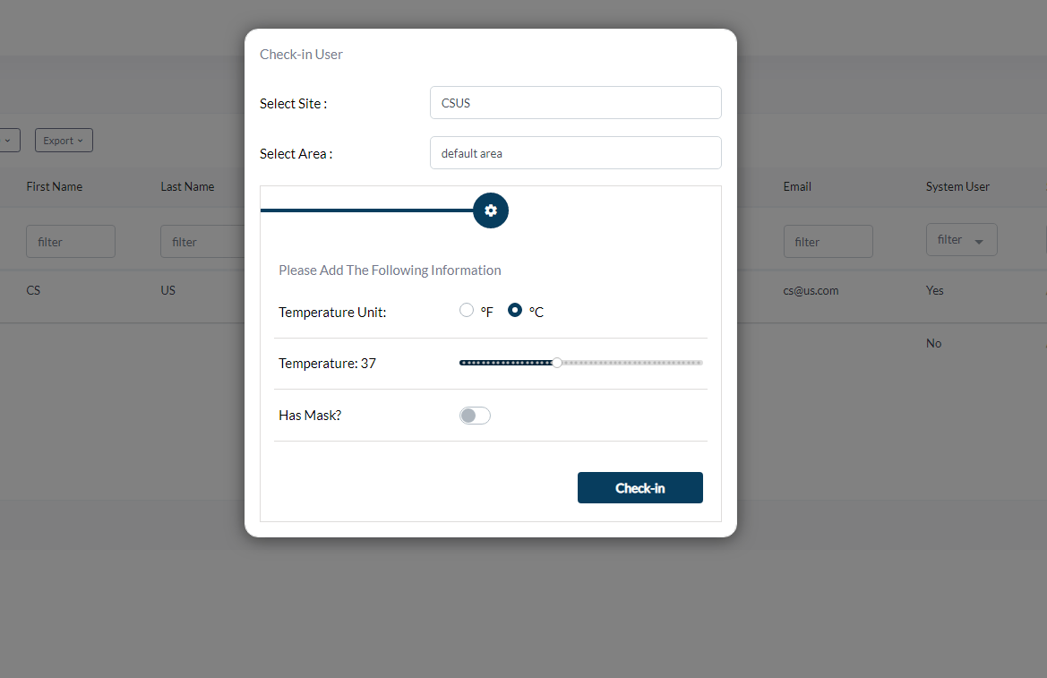 - Check-In User: You can choose to manually sign a user in from the dashboard. Once you click this option you will be presented with this pop-up, which will allow you to choose the site and area the user should be signed into, add user temperature, and if they had a mask or not (depending on your rules).