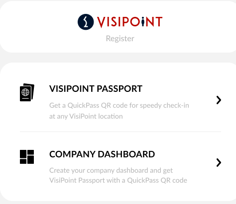 On the registration page, you will see two options – VisiPoint Passport and Company Dashboard. See the image below. Please select the first option to create your passport account.