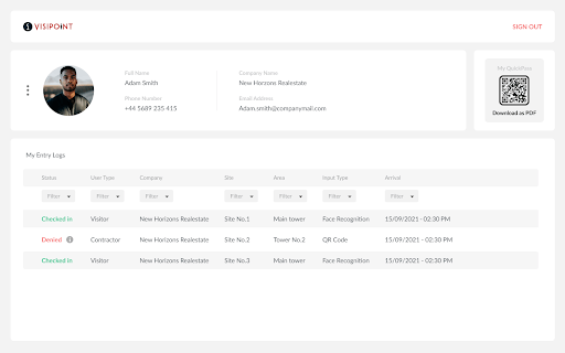 • Access and download your QuickPass QR code (which never expires unless you delete your account) – you can scan this QR code pass to sign in quickly at any VisiPoint entry point.