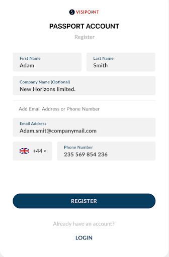 Once you click on VisiPoint Passport you will see the below screen where you can fill in your details to create your account.