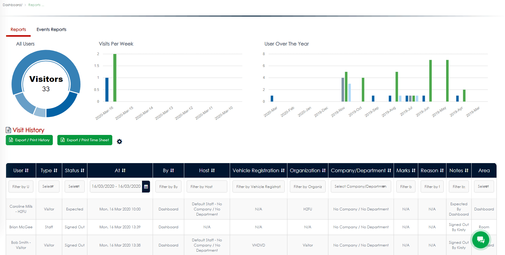 Click on the black cog icon next to the export button. You will then have the option to tick/untick the boxes for a number of fields such as ‘Area’ or ‘Company/Department’. Once you click the apply button your reports will update with the new field selection.
