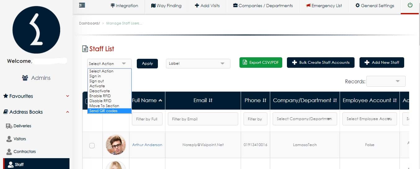 As system Admin/super admin, you can bulk send QR codes to staff members from the dashboard following these steps: